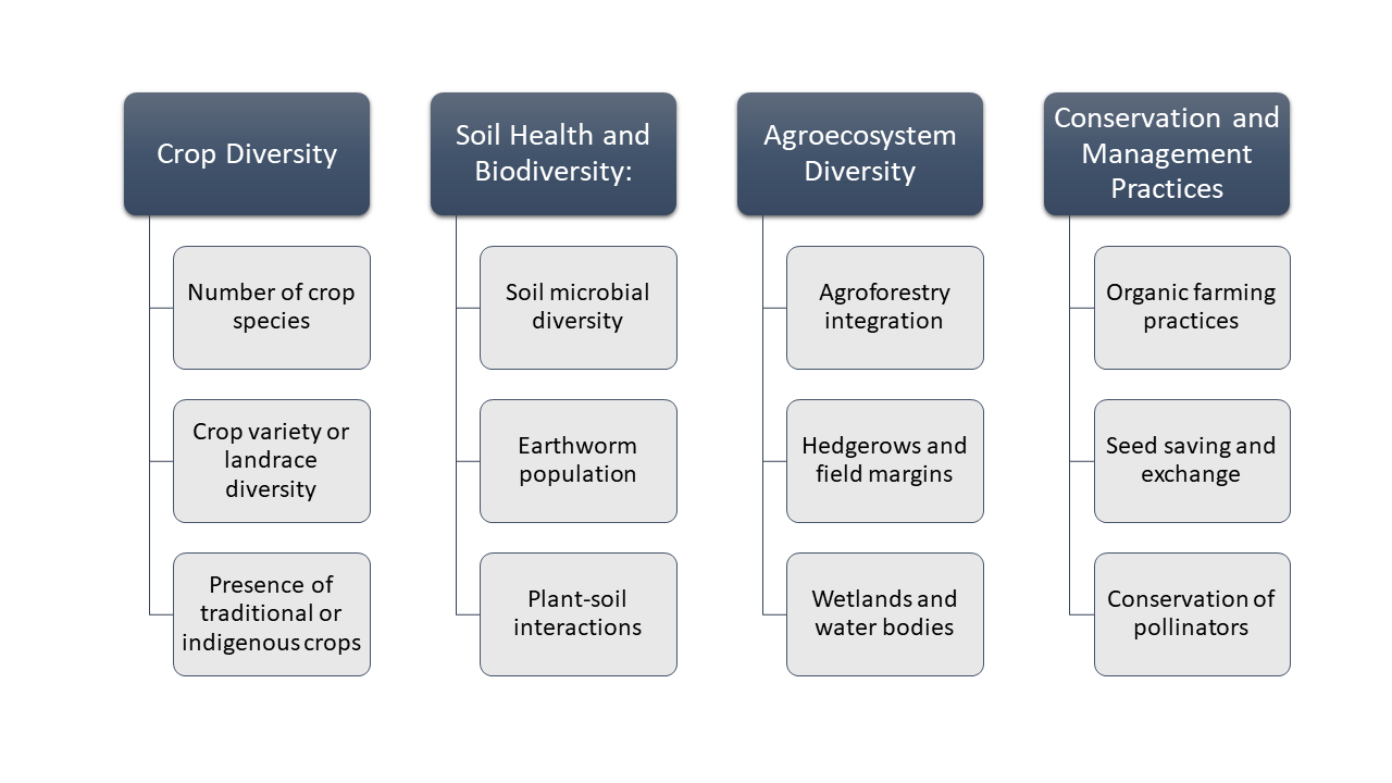 When considering the ABDI, specifically for regenerative agriculture practices, the indicators should primarily assess the diversity and conservation of agro-biodiversity within these farming systems. The following indicators and sub-indicators can be included (see Figure 1).