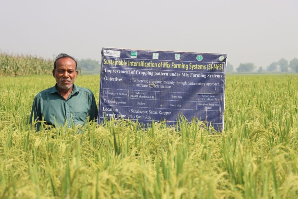 Covering 75% of arable land, rice dominates Bangladesh’s agriculture, but long-duration Aman rice limits crop diversification and leaves fields fallow between two rice harvests. To address this issue, under the Mixed Farming Systems (MFS) initiative, IRRI introduced BRRI dhan75, a short-duration Aman variety harvested 30-35 days earlier than common long-duration types. This enables farmers to grow an extra Rabi crop, boosting their income by increasing system yield and food security. In 2023, a farmer in northern Bangladesh, Birendra Nath Barman, replaced long-duration Aman with BRRI dhan75, followed by mustard or potato, then Boro rice, producing three crops instead of two and earning an extra BDT 10,000–12,000 per 33 decimals of land. He said, “wider adoption of short-duration varieties could increase two crops to three crops in at least 50% of areas in our village”. This innovation also enables earlier rice harvests, providing farmers with food during lean periods, straw for livestock during feed scarcity, and timely planting of winter crops. By increasing crop diversification and promoting crop-livestock integration, this innovation benefited over 5,000 farmers during 2023-2024 by increasing crop diversification and promoting crop-livestock integration.