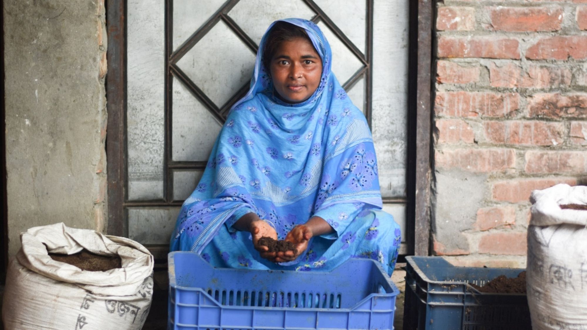 Compost and vermicompost are cost-effective, eco-friendly alternatives to chemical fertilizers, helping improve soil fertility, reducing production costs, and lowering carbon emissions. Composting recycles organic waste such as livestock manure, crop residues, and kitchen waste, while vermicomposting uses earthworms to accelerate decomposition and produce nutrient-rich fertilizer. Both methods can be practiced at the homestead level with minimal investment, offering opportunities for women’s income generation and sustainable waste management. From the MFS initiative, over 600 beneficiaries (80% women) received vermicompost and compost production facilities (e.g., crates, worms, metal sheets for compost shade, etc.), and training. Shahina Begum, a vermicompost producer from Nilphamari district, stated, “I used to rely on chemical fertilizers in my homestead garden, but now I use vermicompost, which leads to at least 30% less reliance on chemical fertilizers. Vermicompost has made my soil healthier and more productive.”