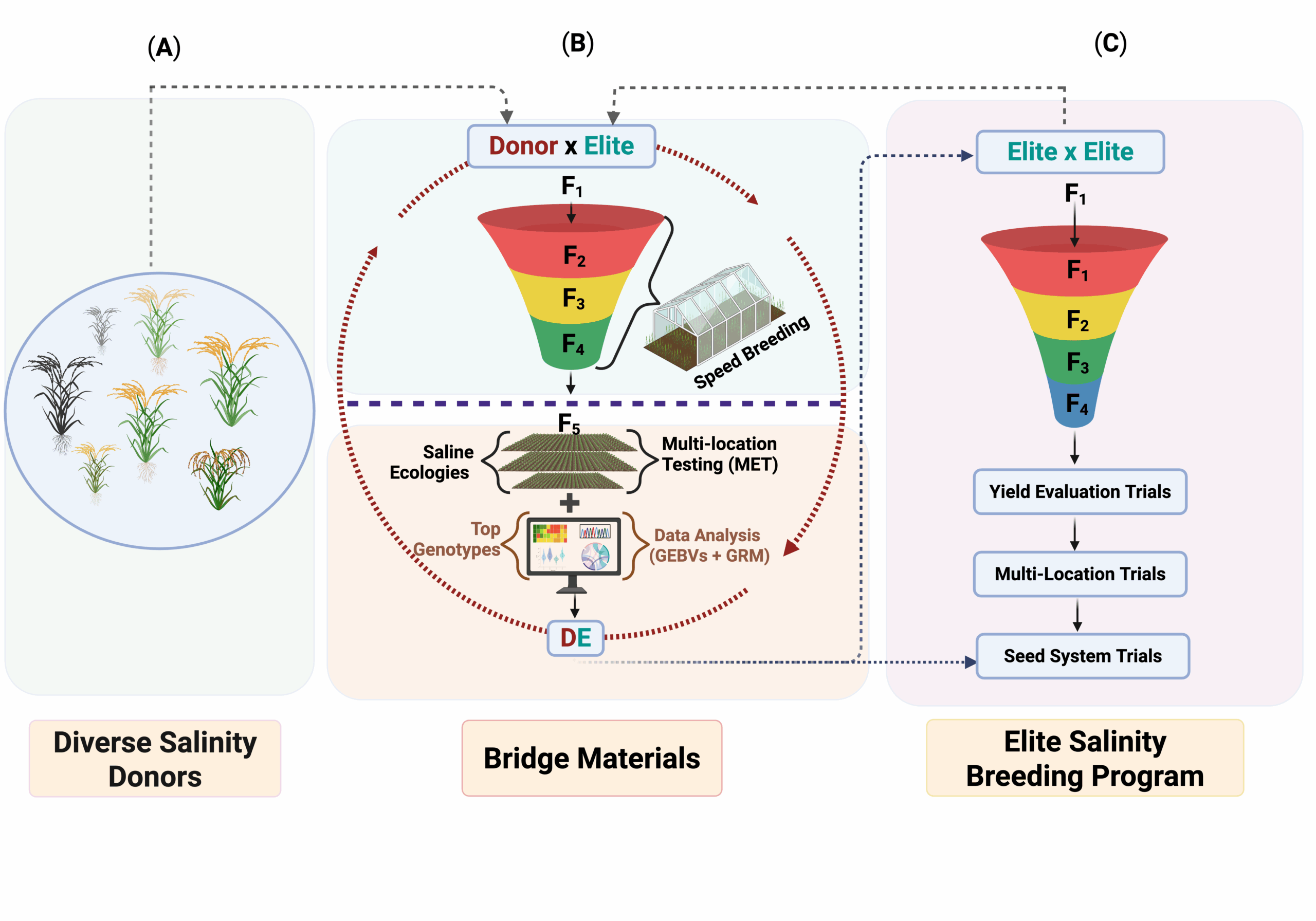 To know more about the Connected Breeding Strategy, readers can access the publication through Anumalla et al. 2025 Salinity-tolerant rice: A sustainable solution for food security and greenhouse gas mitigation (https://doi.org/10.1016/j.cpb.2025.100518) and Revisiting FR13A for submergence tolerance: beyond the SUB1A gene (https://doi.org/10.1093/jxb/erae299)